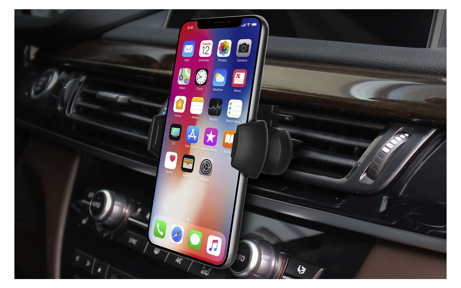Držák mobilního telefonu lze snadno a bez nářadí připevnit na větrací mřížku.Díky nastavitelnému pružinovému klipu je držák univerzální, vhodný pro chytré telefony o šířce 55 - 85 mm.